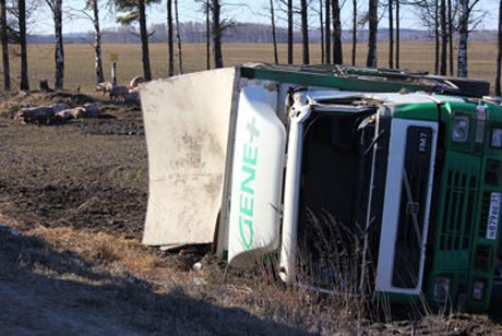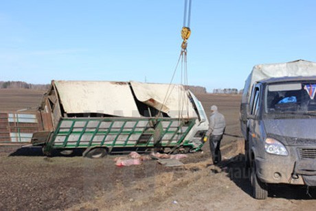 Сегодня 13 марта 2014 год на трассе Орел-Смоленск Брянской области в результате ДТП большегрузный грузовик Volvo, перевозивший более 60 свиней на убой, перевернулся. Инспекторам ветеринарной службы пришлось отлавливать животных, которые разбежались по всей придорожной территории. Как сообщается, «животные следовали» из одного из Белгородских предприятий в Московскую область на ОАО «АПК «Дубино»».Следует отметить, что водитель фуры в результате ДТП не пострадал. В настоящее время правоохранительные органы устанавливают причины, приведшие к этой аварии. Также, в связи с тем, что Брянской области в данный момент применяются режимные меры по борьбе с АЧС, живой груз с многотонки, который отловили ветинспекторы, планируется вернуть отправителю. Тем более что специалисты, проанализировав документацию и накладные на свиней, обнаружили некоторые нестыковки, а также выяснили, что директор предприятия-получателя не подтвердил факт заказа партии живых свиней для забоя. По данному факту тоже ведутся следственные действия.