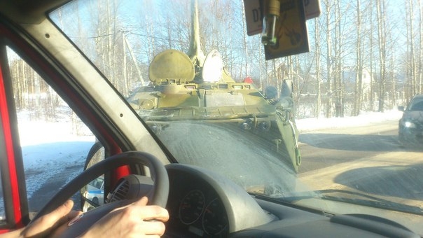 В группе "ДТП и ЧП Санкт-Петербурга" в социальной сети свидетели случившейся аварии сообщают следующее: "Бронетранспортер закрутился в Ковшах и теперь стоит поперек пути. На ликвидацию данной аварии отправлены: эвакуатор, сотрудники ДПС, кран и один БТР". Сейчас у автомобилистов есть возможность только объезда - для этого приходится ехать по обочине.