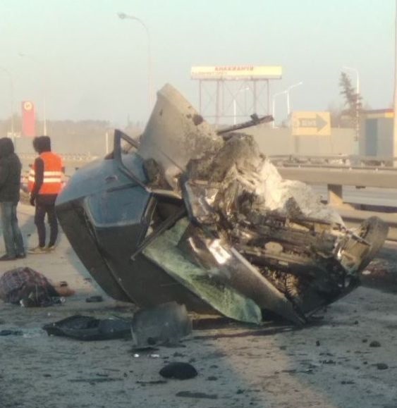 Как сообщают очевидцы, из-за работы коммунальной техники над дорогой повисло облако пыли, в которое и въехала легковушка, скорее всего водитель не заметил грузовик.