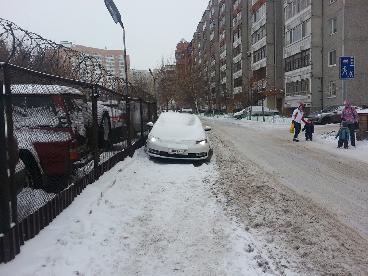 Парковка на тротуаре Ночная ул.Попова, дом 7. Лексус Р 001 КС 72 Снимок сделан 16.01.2014 в 12ч.16мин. Люди с детьми вынуждены идти по проезжей части по льду.< Дата: 17-01-2014, 06:42