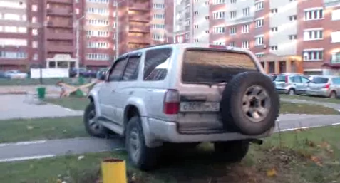 Парковка на детской площадке возле ул.Лунная, д.1... Обращаю внимание на самых наглых у нас во дворе. Топчат, газон, насаждения, человеку вообще по барабану как парковаться. Дата: 25-10-2014, 07:27
